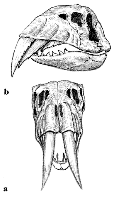 The jaws of the cutlasstooth can open remarkably wide, so that the lower jaw is well away from the cutting teeth when the heavy head is thrust downwards in the slashing stroke (c). The undersides of the large teeth are serrated and work against the lower teeth as carnassial (meat-shearing) blades for ripping and chewing flesh when the animal is eating.