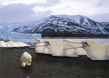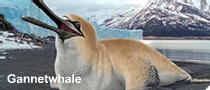 While the gannetwhale enjoys complete freedom from predators in the sea, the mothers and their young are at risk on land. To protect themselves and their offspring from marauding land predators such as snowstalkers, the birds nest on the islands. But if a winter is cold enough, ice bridges will allow land predators access to the colonies. Such conditions invariably give rise to the decimation of gannetwhale populations. They do, however, have a special defense against predatory mammals like snowstalkers, which is regurgitating up a revolting, foul-smelling mixture of partly digested fish and squid (this is too much for a snowstalker's sensitive nose).