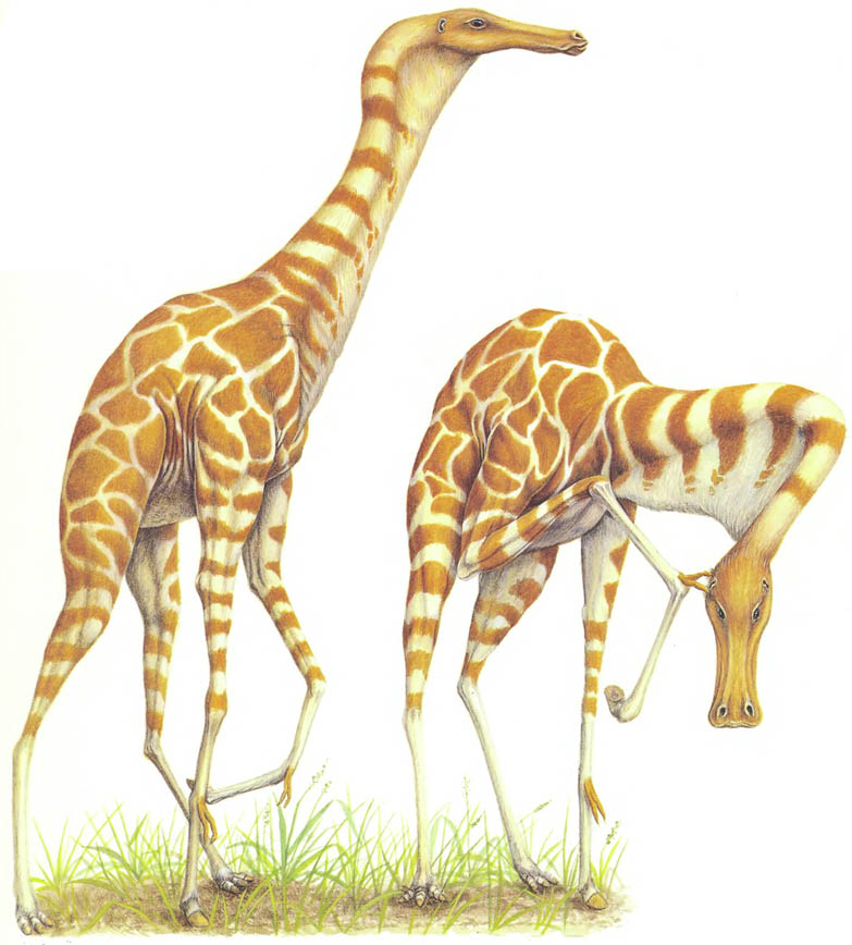 The tropical grasslands, when they developed and spread halfway through the Miocene, were a totally novel environment for the great dinosaurs. Grass is a remarkably tough substance, and a grass-eating animal needs a number of extreme specializations to allow it to survive. Grass is full of hard silica and so it causes a great deal of wear to teeth. A grass-eating animal needs teeth that are constantly growing or frequently replaced. Complex digestive systems are needed to break down and extract nutrients from the substance of grass. On top of all that, a big grassland-living animal needs to have long legs to allow it to run away from danger. In some places, such as the prairies of the North America, non-avian dinosaurs developed quite happily into grass-eating forms. However, on the savannas of the African continent, herbivorous non-avian dinosaurs were not able to establish much of a foothold. They were primarily beaten to it by their cousins, the pterosaurs. A group of pterosaurs abandoned their powers of flight as soon as the tropical grasslands spread, and they became the main grass-eating animals of Africa. The lank is now the most highly specialized of these, and the one that has become most unlike its flying ancestor. The body has remained short but the forelimbs and hind limbs have become long and equal in length. The neck and face are also long; all plains-living features.