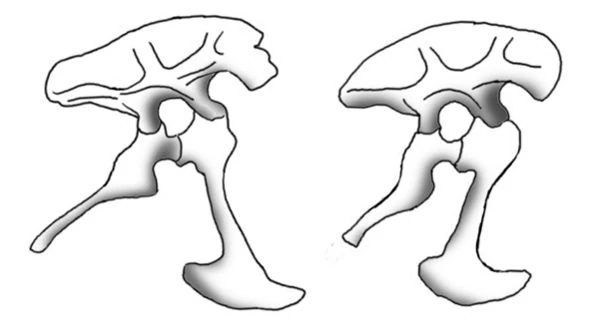 (fig. 2) Pelvis of the Cretaceous tyrannosaurid Tyrannosaurus (left) alongside that of the errosaurid Smilotyrannus (right).