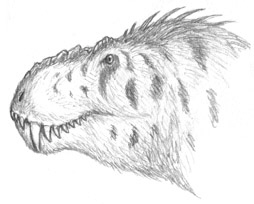 Sabre-tyrants are masters of the bleed-to-death hunting strategy employed by their extinct cousins, the tyrannosaurids, as well as their closest RL counterparts, the saber-toothed cats. Their incredibly long fangs, coupled with the typical tyrannosaurian battery of D-cross-sectioned scooping teeth at the front, and slicing, steak-knife teeth toward the rear, create a flesh-cutting machine that can gouge huge chunks out of muscle, slice tough tendons apart, and rip a vertebral column to splinters. A sabre-tyrant will inflict the worst damage it can upon its victim, then dash back to safety and wait for the hapless creature to expire from blood loss before returning to feed.