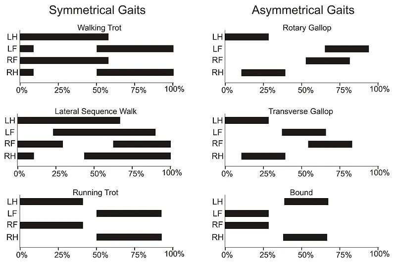 Graph showing the time each feet touches the ground in different quadrupedal gaits. In symmetrical gaits right and left limbs strike the ground alternately.